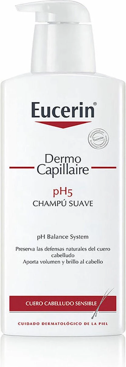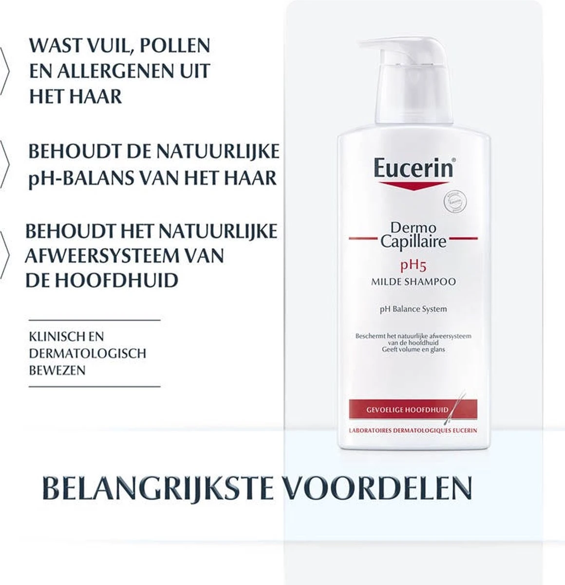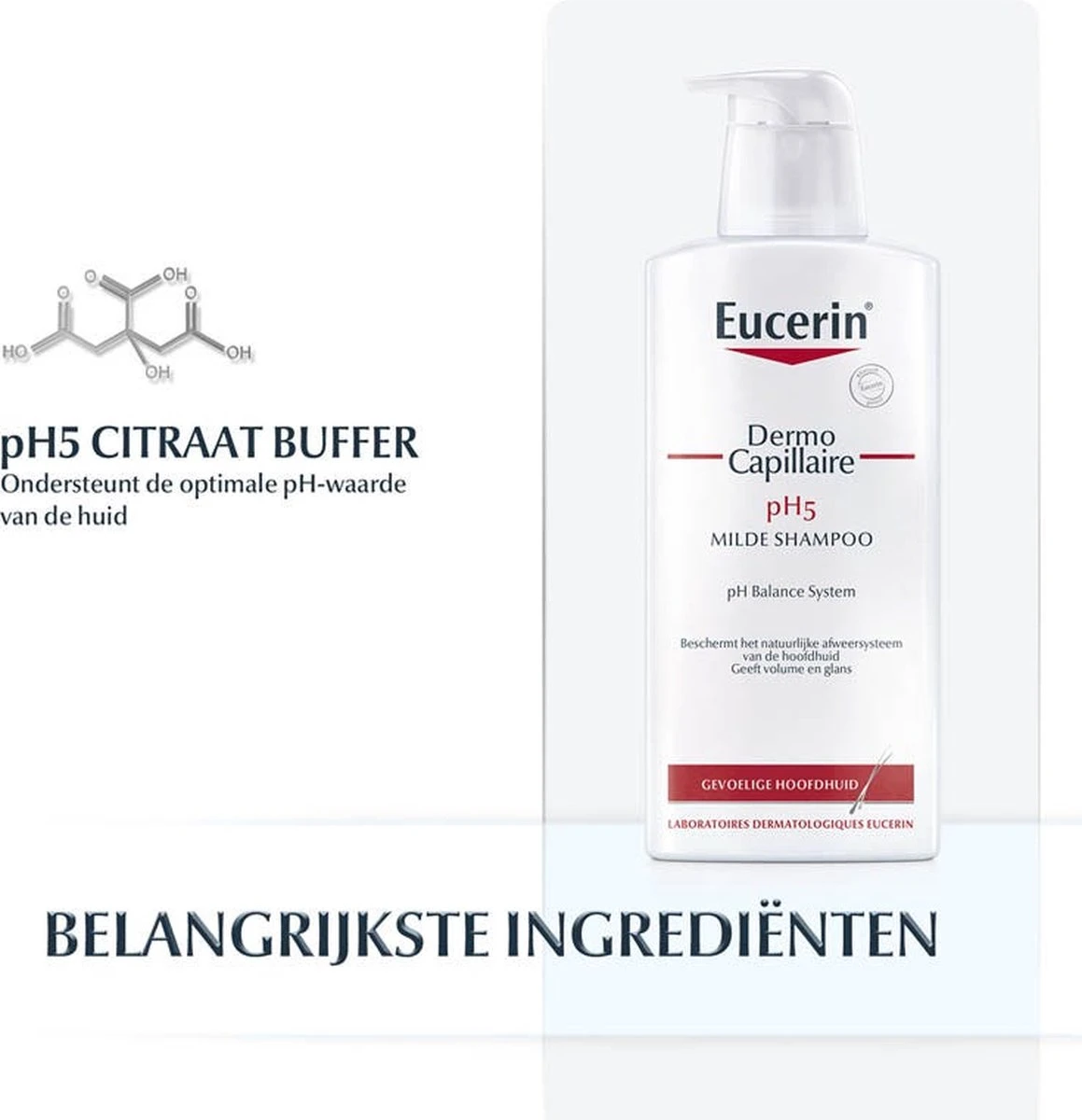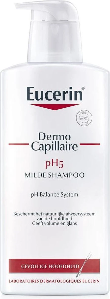 Een gezonde huid heeft een pH-waarde van 4,5 tot 5,5 en is dus licht zuur. Deze natuurlijke zuurgraad beschermt je hoofdhuid tegen schadelijke bacteriën en andere stoffen. Wanneer de balans wordt verstoord, bijvoorbeeld door hitte, kou, ziekte, cosmetische producten of stress, kan dit leiden tot een gevoelige hoofdhuid. Eucerin DermoCapillaire pH5 MILDE SHAMPOO is specifiek ontworpen voor het behoud van de natuurlijke pH-waarde van je huid en reinigt je hoofdhuid en haar doeltreffend om uitdroging en irritatie te voorkomen. Deze wast vuil, pollen en allergenen weg en geeft je haar een gezonde glans en zorgt dat het zacht en soepel aanvoelt.