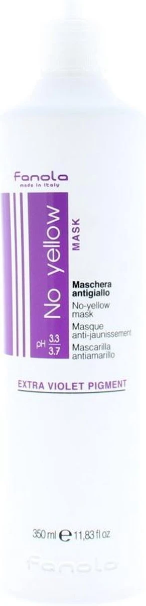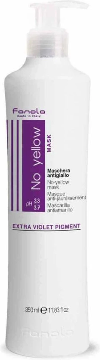 De Fanola No Yellow Mask is de anti-geel masker voor gebleekt, blond of grijs haar. Het masker kan worden gebruikt bij highlights, balayage, grijs haar, coupe de soleil en blond (geblondeerd) haar. De ijs, grijs en as tonen worden langer behouden. Het masker is geformuleerd met speciale violet pigmenten dat de ongewenste gele tinten neutraliseert. Het haar krijgt een keole, zilverachtige blonde tint en de gele kleur verdwijnt uit het haar. Het product heeft een zeer aangename geur en is niet schadelijk voor het haar. De Fanolo Mask Maschera Antigiallo is niet alleen een anti-geel masker maar brengt glans en zachtheid terug. Professionals raden aan om naast shampoo en conditioner, ook een haarmasker te gebruiken.