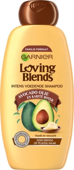 Speciaal voor zeer droog haar tot pluizig haar heeft Garnier Loving Blends een intens voedende shampoo ontwikkeld. Een formule met een combinatie van: avocado olie voor het versoepelen van het haar en fair trade Karité boter voor intense voeding.