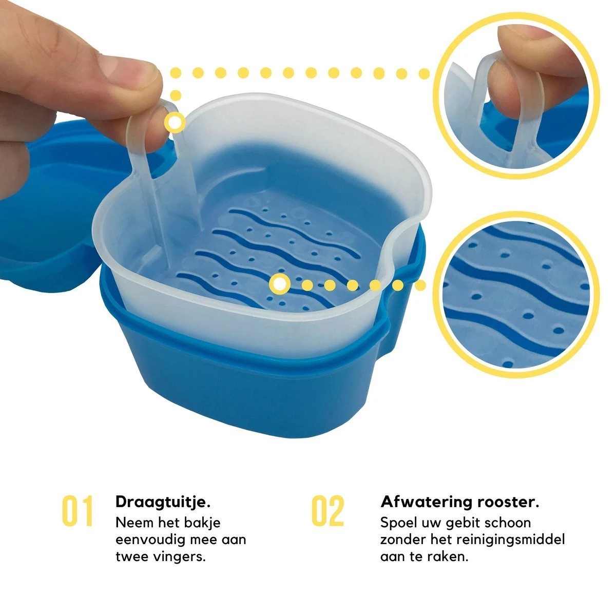 Gebitsbakje/ Kunstgebitbakje 9,5×9,2×6,8cm. Inclusief lekbakje.