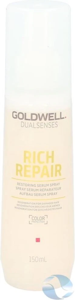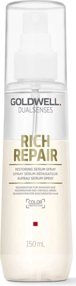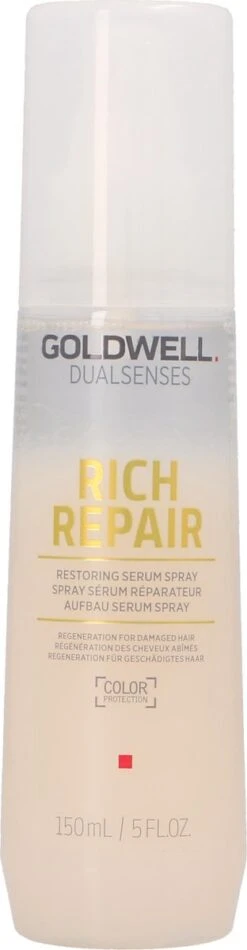 Goldwell Dualsenses Rich Repair Retoring Serum Spray is een leave-in conditioner dat het haar direct reconstrueert ,glans en souplesse geeft. Ontwart het haar op een zachte manier en verbetert de kambaarheid.Bevat tevens een hittebesherming
