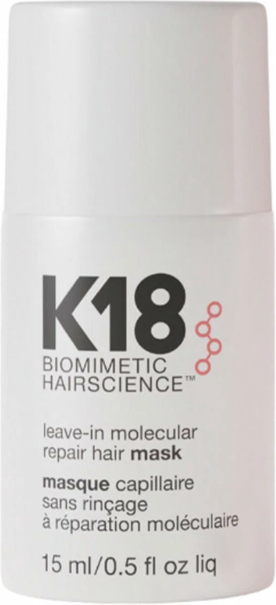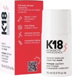 K18 Hair Leave-in Molecular Repair Mask is gepatenteerde bio-actieve peptide dat de elasticiteit versterkt en verbetert van je haren. De behandeling is geschikt voor haar dat beschadigd is geraakt door chemische behandelingen of het gebruik van hittetools. Het herstelt op een peramente manier, de schade van chemische behandelingen en hittestyling. Bevat een unieke reeks peptiden die het mogelijk maakt het haar tot diep in de wortels te herstellen. In slechts 4 minuten wordt de natuurlijke keratine structuur van het haar gerepareerd en is het haar weer als nieuw. Het product is lichtgewicht en heeft hydraterende eigenschappen. K18 is het eerste product dat biomimetica gebruikt om keratine ketens opnieuw te verbinden en aan te vullen die verbroken waren door bijvoorbeeld blonderen, kleuren of gebruik van stylingtools. Het resultaat is zacht, glad en sterk haar met veerkracht dat weer als nieuw aanvoelt.