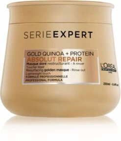 L’Oréal Serie Expert Absolut Repair Gold Masker is het ideale masker voor beschadigd haar. L’Oréal Serie Expert Absolut Repair Gold Masker versterkt verzwakt haar en laat het weer stralen. Het haar voelt direct gezonder aan en is zachter, glanzender en makkelijker te ontwarren. Het herstellend masker is uitermate geschikt voor beschadigd haar omdat het de vetten in het haar weer hersteld. Verder maakt het het haar zachter, sterker en bevat het een UV-filter om het haar te beschermen tegen schadelijke invloeden van buitenaf. De formule is ideaal voor dikker haar en bevat zeer kleine moleculen die de haarvezel beter binnendringen en tot diep in de beschadigde delen kunnen komen. Het luxe haarmasker heeft een goude textuur dat zorgt voor verzorging voor beschadigd haar en intens herstel zonder residu achter te laten. Voor het optimale resultaat is het golden masker te gebruiken met de andere Asbolut Repair Gold producten.