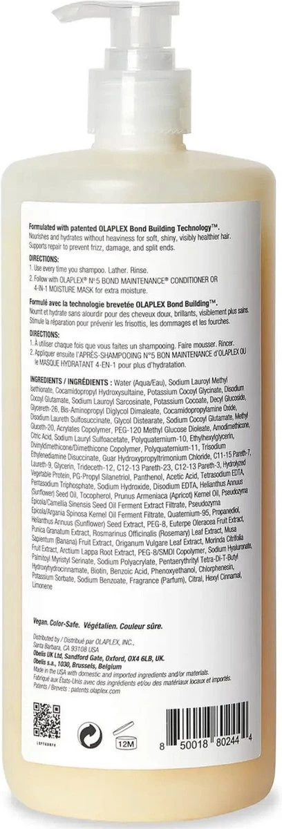 De Olaplex Nº 4 Bond Maintenance Shampoo reinigt en hydrateert het haar. Deze sulfaatvrije shampoo reinigt het haar grondig zonder de haarkleur aan te tasten. Het is 100% vegan en bevat geen parabenen, sulfaten of gluten. Bovendien verbetert de shampoo de interne haarstructuur en vermindert het haarbreuk. Het resultaat is prachtig glanzend en gehydrateerd haar dat makkelijk te stylen is. Kies voor Olaplex No.4 Bond Maintenance Shampoo als je op zoek bent naar een hoogwaardige, professionele haarverzorging voor alle haartypes.