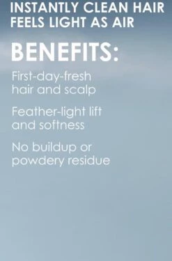 Het haar voelt net gewassen, schoon, volumineus en zacht aan zonder dofheid, stijfheid of schadelijke droogheid en opbouw. Je kunt deze droogshampoo ook perfect gebruiken om textuur en volume te creëren. Het stoot geurtjes en schadelijke stoffen af zonder de poriën te verstoppen.