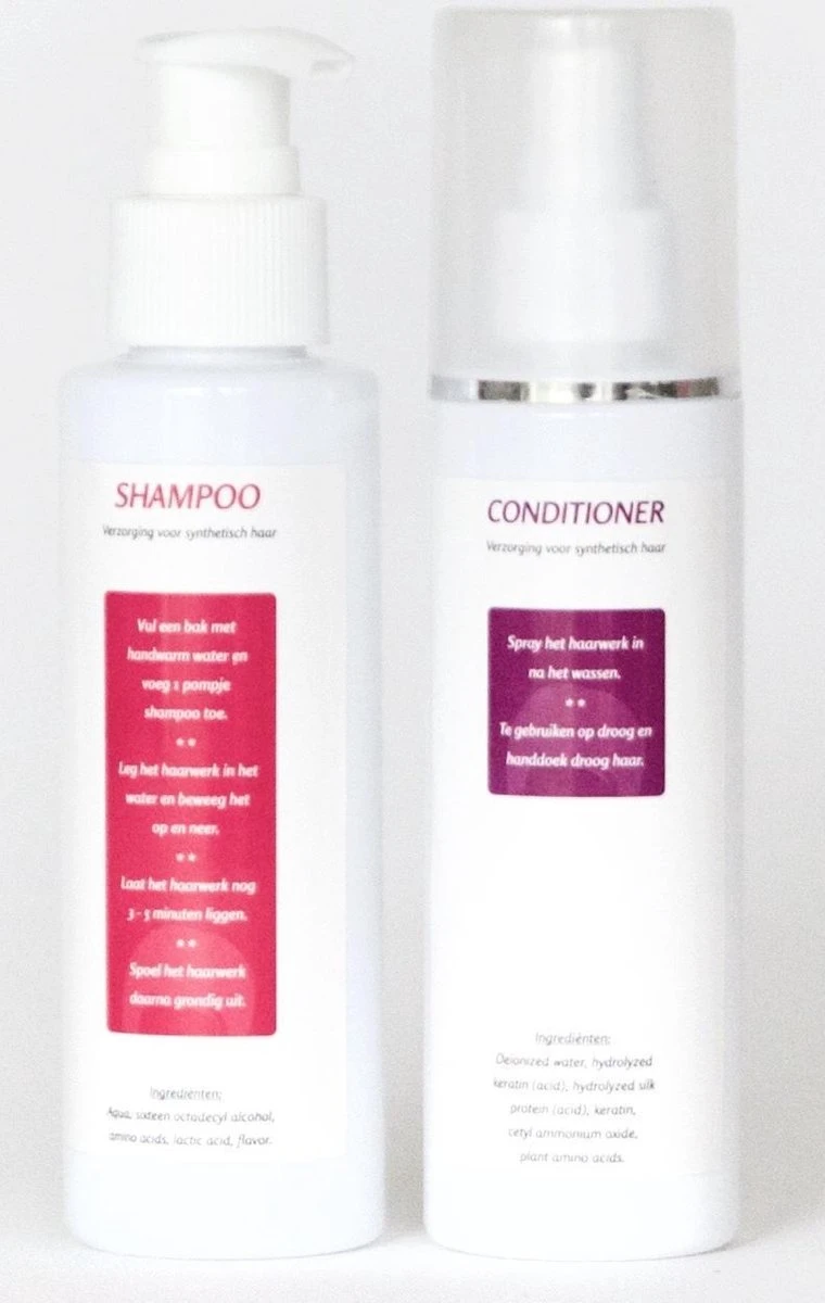 LET OP: Dit is shampoo en conditioner voor synthetisch haar zoals een haarwerk/haarstukje/extensions. Beide flesjes hebben een inhoud van 125 ml. De shampoo is sterk geconcentreerd dus 1 á 2 pompjes is ruim voldoende.