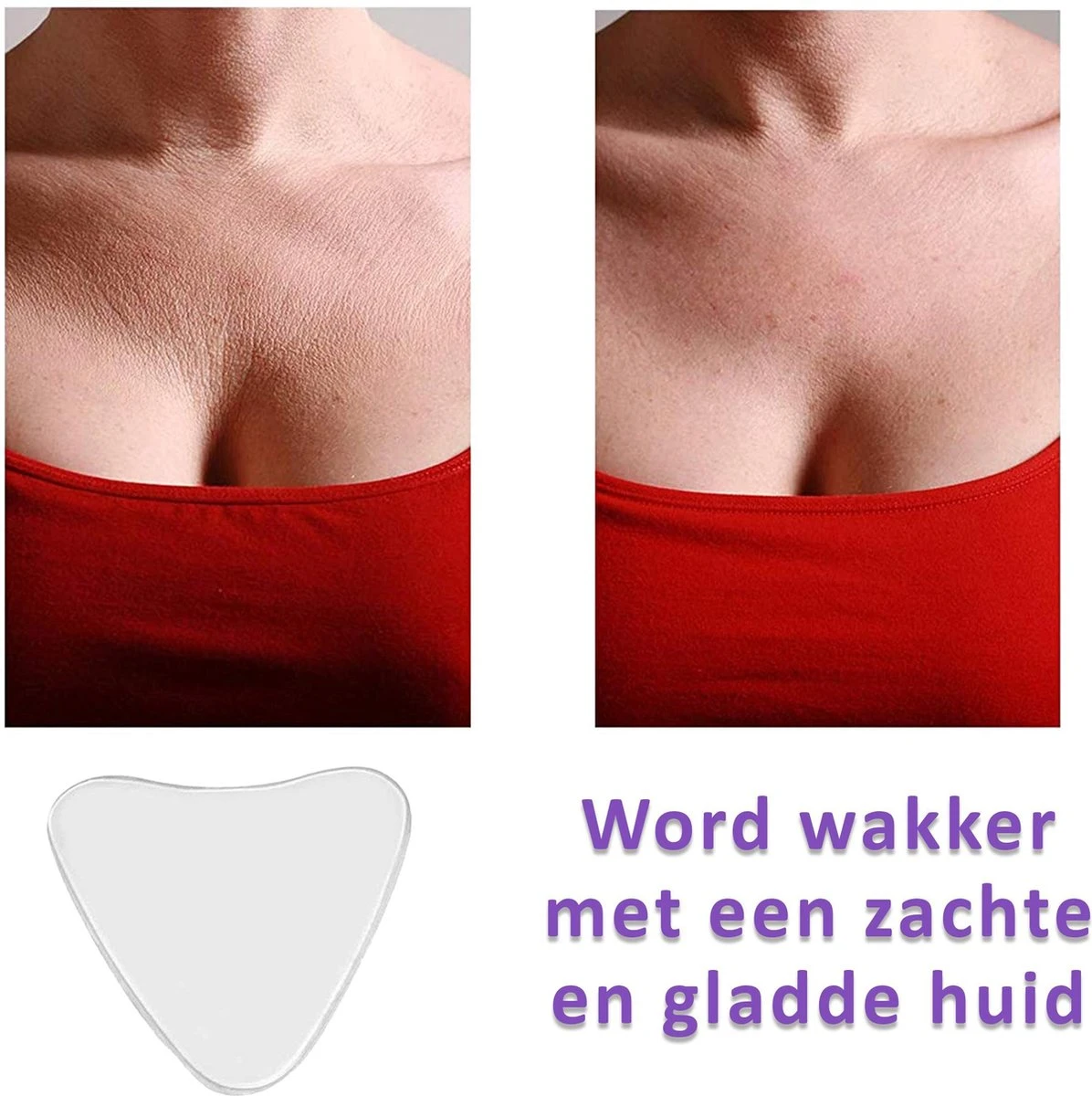 Vaak slapen vrouwen het liefst op hun zij, waardoor zij op den duur verticale rimpels of ‘slaaprimpels’ tussen hun borsten ontwikkelen. Deze decolleté pad hydrateert en verstevigt de huid van je decolleté en voorkomt dat de huid in elkaar wordt geduwd tijdens het slapen. De pad is gemaakt van 100% medische graad siliconen, wat in de medische wereld wordt gebruikt om littekens en andere huidaandoeningen te helen. Siliconen stimuleert de aanmaak van collageen, stopt uitdroging van de huid en houdt de natuurlijke vochtbalans op peil. Je huid voelt na gebruik weer zacht en glad aan.