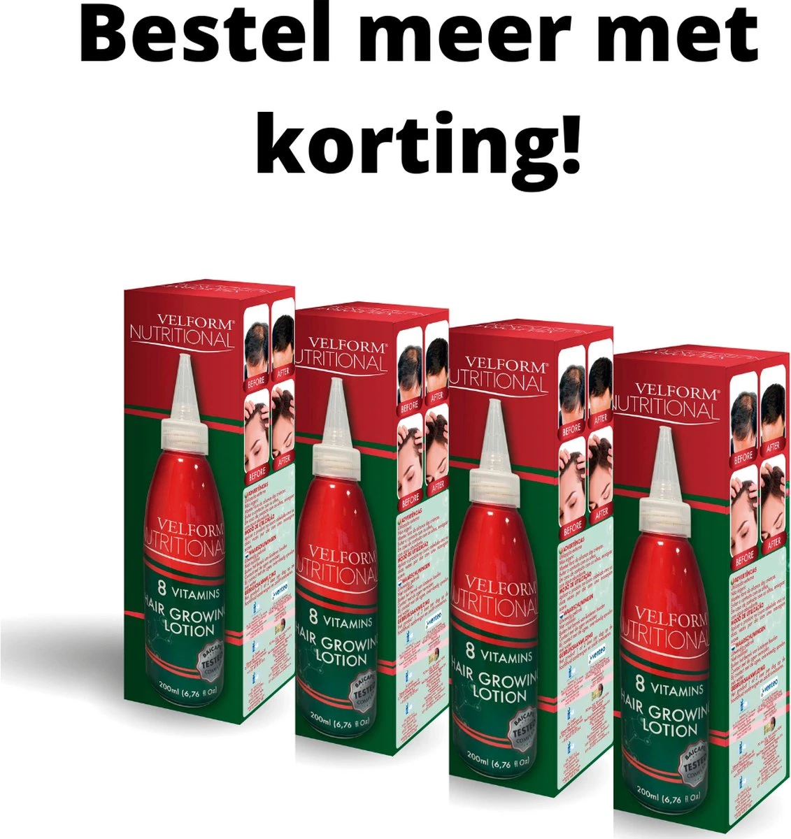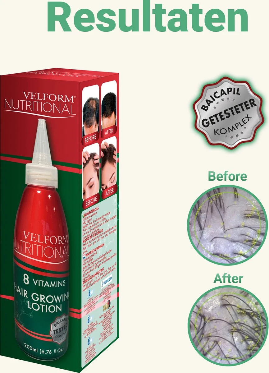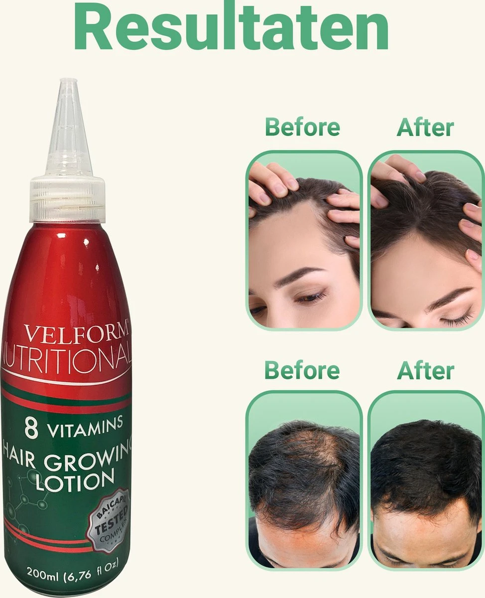 Uit verschillende testen bleek dat Velform Nutritional bij zowel mannen als vrouwen voor een mooie haardos zorgt. Het haar werd weer voller en dikker waardoor kale plekjes verdwenen. Het optimale gebruik van Velform Nutritional bij elke wasbeurt zorgt ervoor dat haargroei wordt bevorderd. De aanwezige proteïnen en vitamines zorgen voor een gezonde hoofdhuid waar haarfollikels weer kunnen ademen en stevig kunnen groeien.