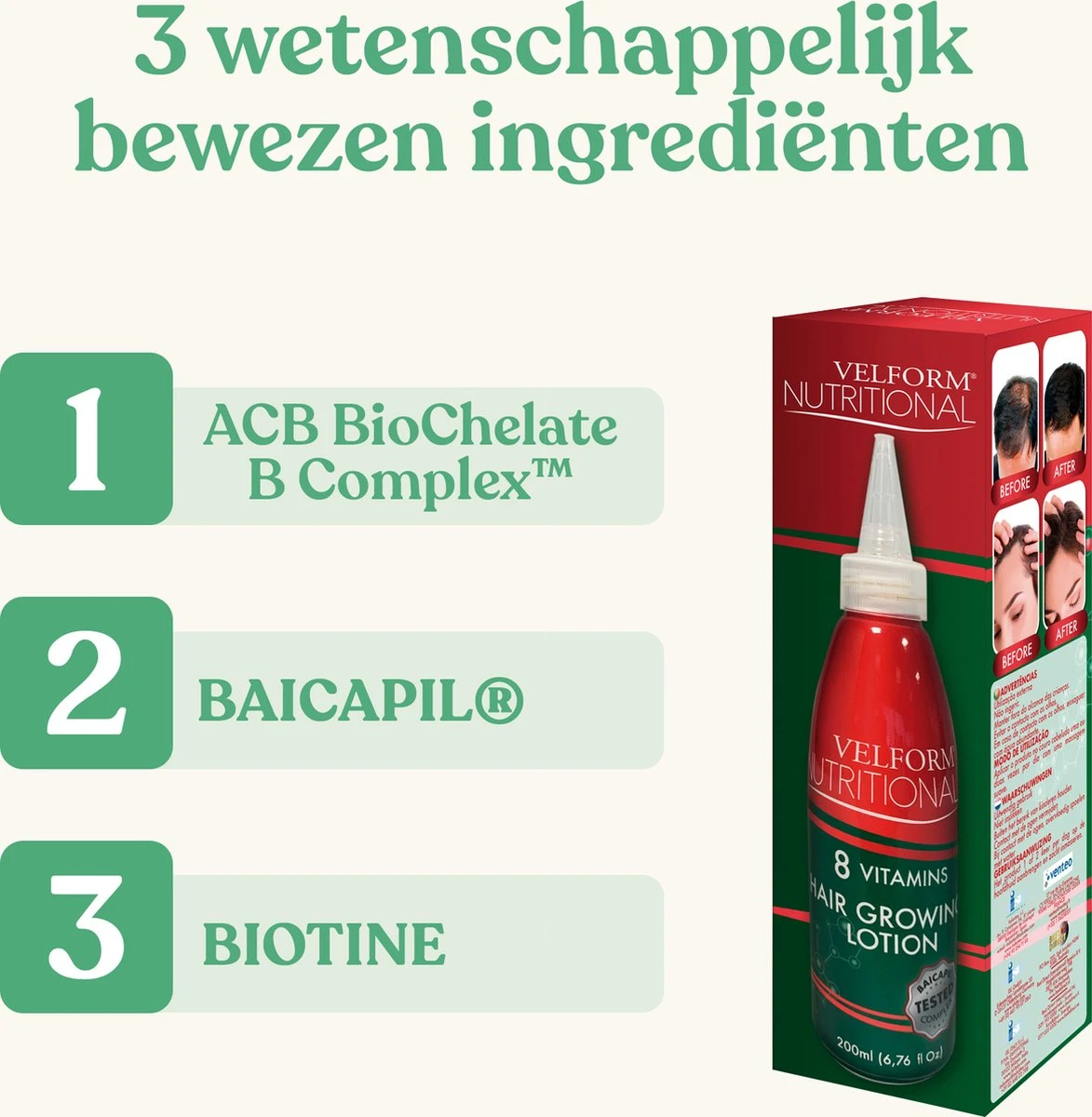 Een van de actieve bestanddelen van Velform Nutritional is BAICAPIL®. Dit ingrediënt in combinatie met ACB BioChelate B Complex™ stopt haaruitval en bevorderd de natuurlijke haargroei. De combinatie van de 3 natuurlijke plantaardige ingrediënten en de 8 vitamines B zorgt ervoor dat de hoofdhuid wordt verzorgd en verstevigd. Tijdens de wasbeurt worden de haarzakjes gestimuleerd en kan er nieuw haar groeien. Een optimaal gevoede hoofdhuid is de sleutel tot dikkere haargroei.